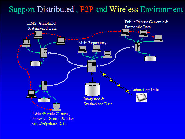 This figure simply illustrates that scientists and bioinformaticians access a multitude of data repositories through Local Area Networks (LAN) within their organizations, through the internet to public and private providers, directly through Peer-To-Peer (P2P) collaborative connections and through an assortment of wireless devices and connections such as in laboratories or healthcare environments. A Bioinformatics system must be designed to allow data mining and integrating of information from many data sources that may be local or distributed around the world.