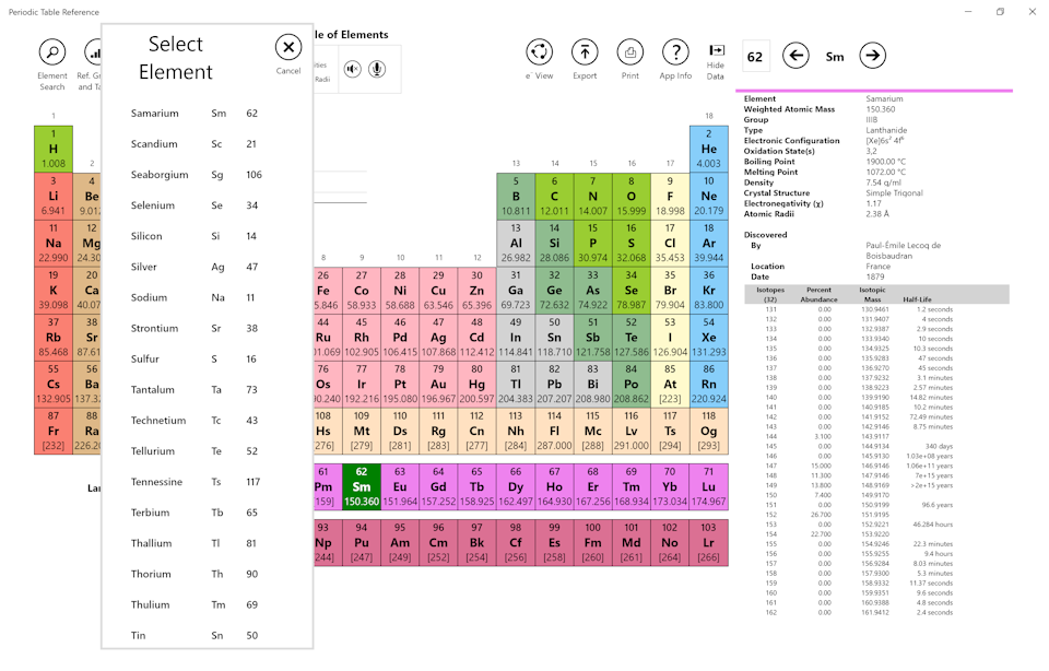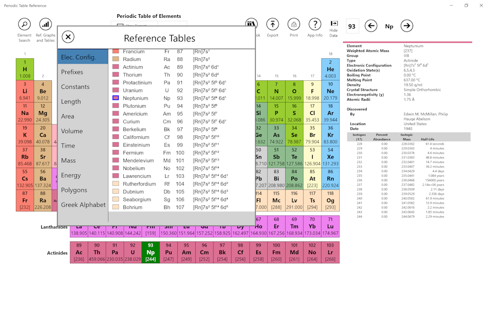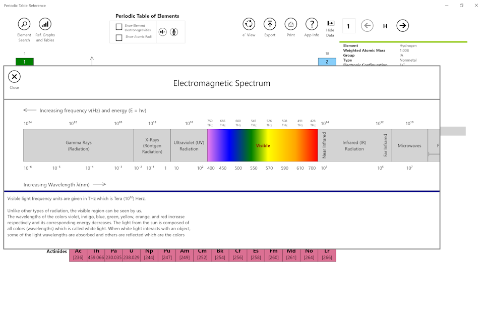 This app displays the periodic table of elements as seen below. It is designed for touch enabled computers and tablets. The table is interactive in that each cell representing an element is touch active. Tapping on an element will display the properties of the selected element. Properties include Atomic and Isotope masses, Group, Type, Electronic Configuration, Oxidation States, Boiling and Melting points, Density, Crystal Structure, Electronegativities and Atomic Radii. Element discovery information is also displayed which includes who or what group discovered the element, location and date of discovery. The Periodic Table and the data for the selected element can be printed and exported to .png formatted image files or to the clipboard. In addition, the app supports printing of the legend, alphabetical and atomic numbered ordered lists and element electronic configurations. An Energy graph of the selected element's electronic configuration showing pairing of electrons with spin up and down arrows is now displayed and updated as an element is selected.. In addition, a timeline graph of the dates of element discovery and a graph of the electromagnetic spectrum have been added as have a number of reference tables. Options have been added that will show within each cell Electronegativities or Atomic Radii. Also, voice output and input has been implemented which is good for students learning the table and those that want to navigate the table quickly. Tapping on the speaker button activates it and then as an element is selected the element name will be pronounced. Tapping on the microphone button activates it and then as the name of an element is pronounced by the user that element is selected. http://apps.microsoft.com/windows/app/periodic-table-reference/61a77348-c8ac-4a0a-996e-b7b3dcd696ca