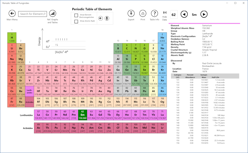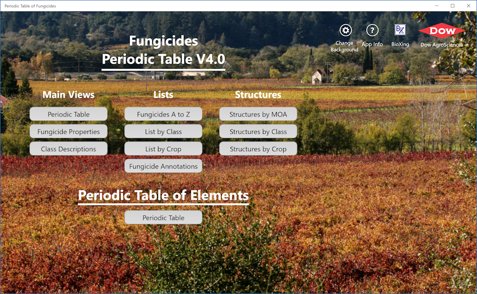 Periodic Table of Fungicides 4.0 (UWP) Version 4.0 is a major update to the previous electronic version (3.2), which was released in 2012. Version 4.0 includes updates to the data for all entries. Newly named fungicides and their structures have been added. Various types of information were add including CAS registry numbers, years of first registration or launch, vapor pressure and basic efficacy spectrum. Search capability has been improved by adding a Structure by Mode of Action search feature. In addition to displaying the major crop uses for each fungicide, a comprehensive crop list has been added through which the main fungicides used for each crop can be found. Along with updates to data, the user interface has been updated that facilitates better coordination between each of the application views. Microsoft's Windows 10 UWP (Universal Windows Platform) version. This version of the Periodic of Table of Fungicides application has been designed for Tablets and touch devices such as laptops and workstations with touch screens. That is, all operations can be carried out using touch. This version for Microsoft's Windows 10 operating systems can be downloaded from the Windows App Store with installation placing the App in the collection of tiles on the start screen. Simply tapping on the tile will launch the app. Future updates will also use the standard App Store update mechanism through the App Store start screen tile. Note: A desktop version (workstations and laptops) is available that can also be used on tablets running Windows 10. Most operations can be performed using touch; however, the desktop version was primarily designed for use with a pointing device such as a mouse.