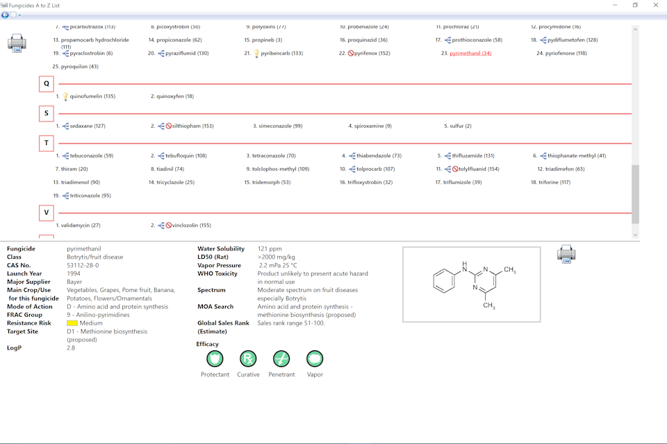 View showing an alphabetical list of fungicides where tapping on a fungicide name will display its properties.
