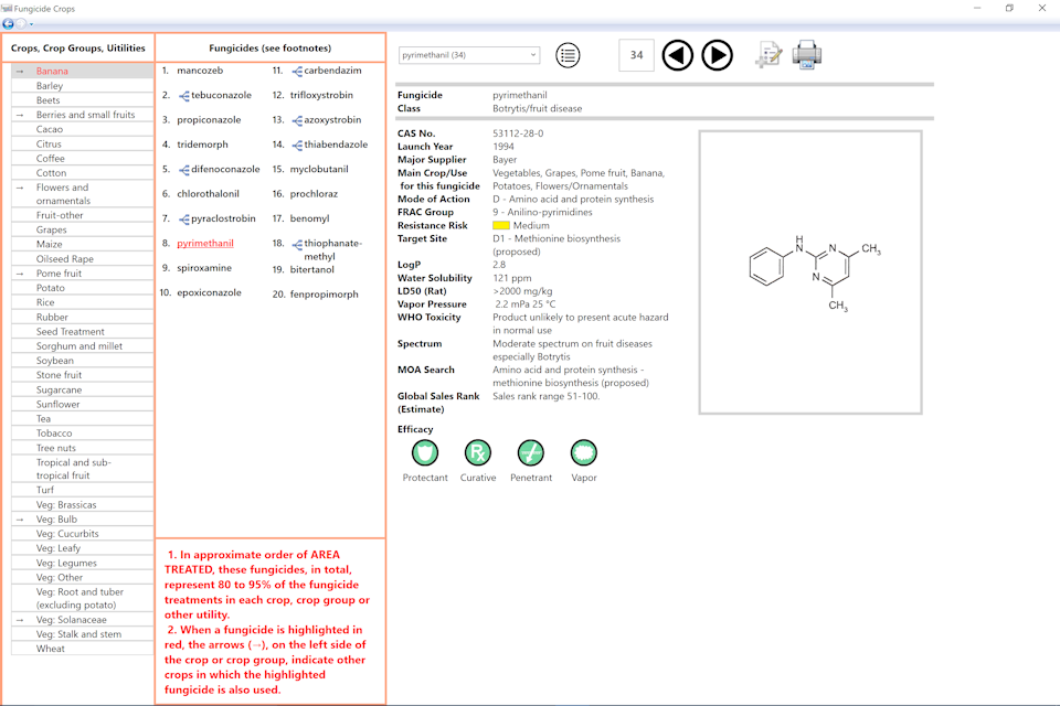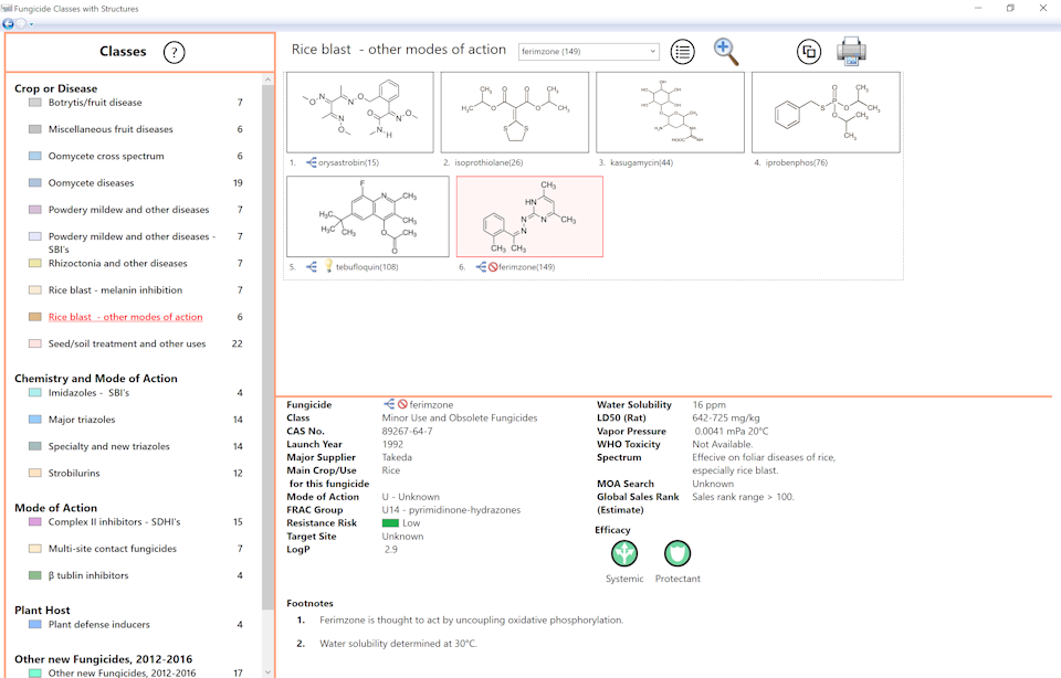 View showing the list of fungicide classes. Tapping on a class will display the molecular structure of each fungicide in the selected class. Tapping on a fungicide structure will display its properties.