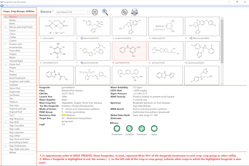 View showing the list of fungicide crops, crop groups and utilities. Tapping on a crop will display the molecular structure of each fungicide applicable for the selected crop. Tapping on a fungicide structure will display its properties.