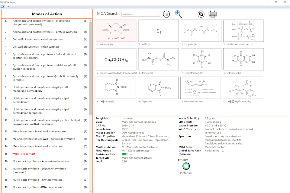 The Fungicide App, in addition to the Periodic Table of Fungicides view, has a number of different views based upon the properties of the fungicides such as alphabetical name, by crop name, by class name and Mode of Action (MOA).