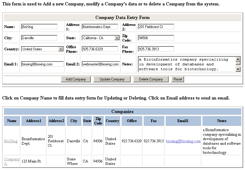Companies or Granting AgenciesThis section adds information about companies or granting agencies that provide contracts, grants and samples for the various projects and routine sample assaying and reporting. Companies Data Entry FormThe following is a screen capture of a fully functioning Web application for entering companies into the system.