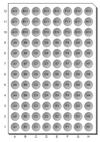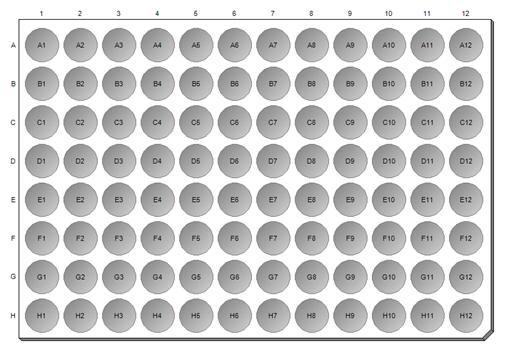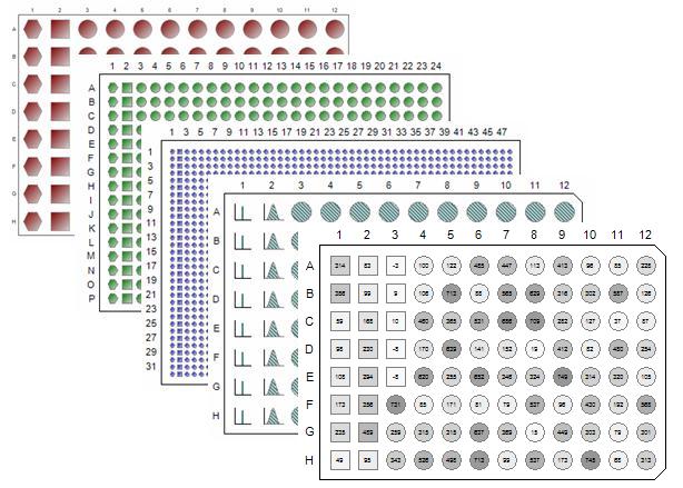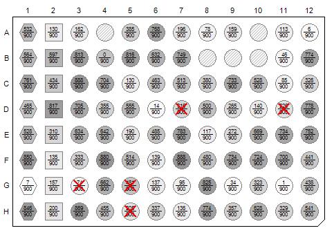 The following figure shows a 96-Well microtitre plate view with three different well shapes that could represent Standards, Controls and Samples. It also shows wells that are empty using a cross-hatch pattern and wells that are marked excluded with red X’s. Filled wells have a gray-scale pattern showing magnitude and the well interior annotation displays a ratio of a measured magnitude to a maximum value. The plate shape has a Bottom-Right corner cut.