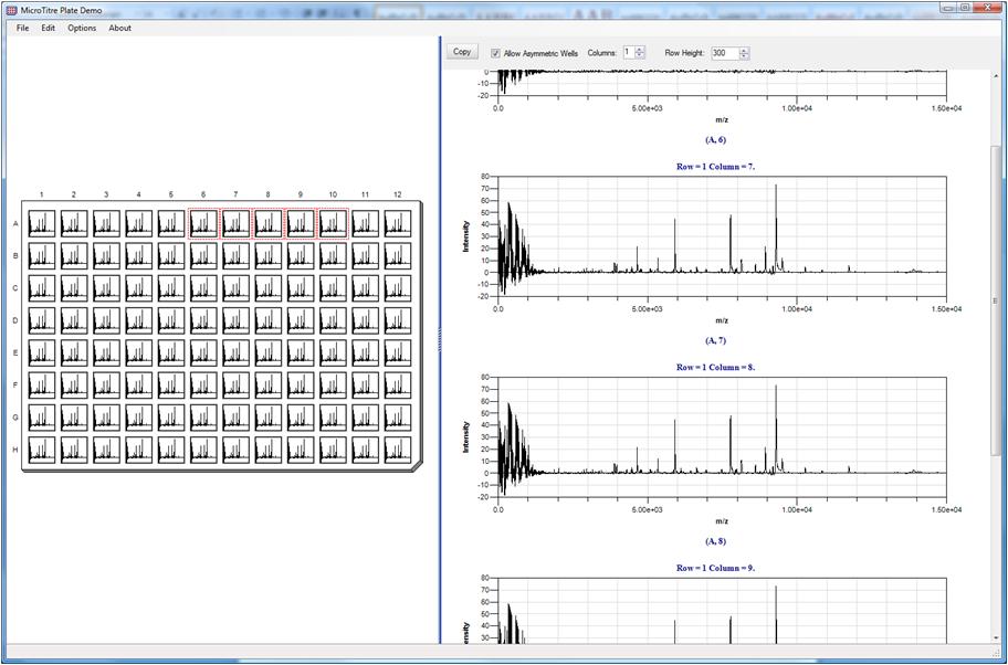 This view shows displaying of graphs within wells and the collection of wells from A6 to A10 were selected and are displayed within the embedded magnifier viewer. The option 'Allow Asymmetric Wells' is checked which relaxes the restriction that width must equal height and is more suitable for comparing collections of graphs. In this view the demo program created 96 instances of the same graph data for illustrative purposes, but all wells can contain different data.