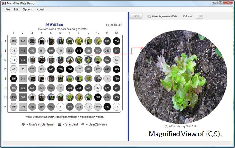This view shows a plate containing plant images within wells which shows the state of the plant from where the well sample was taken. The component has an option for creating and showing an embedded and a popup magnifier viewer. As the mouse is moved over a well, its current display content is automatically magnified in the viewer and selecting one or more wells will cause them to be displayed within the viewer for more detailed comparison.