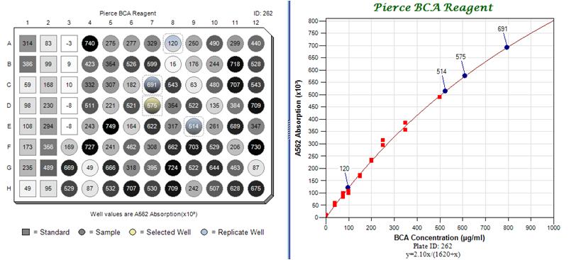 This section contains a number of images showing examples of different plate views and component features. These examples, with more detailed descriptions are contained in the downloadable Views document. The following image is taken from a Standard Curve application being developed by BioXing. The plate provides a summary view of the data as well as an interactive graphic linked to a graph and to a data table (not shown). On the left the microtitre plate contains 21 standard wells from A1 to E3 represented by square wells and samples represented by circles in the remaining wells. The gray scale colors of the wells reflect the magnitude of absorption and the annotation numbers within the wells provide the magnitude. The square-cornered dashed-line rectangle at D7 with a yellow gradient indicates that it was the primary selected well and the three rounded-corner dashed-line rectangles with blue gradients at A8, C7 and E9 indicate that these samples are replicates of the sample at D7. In the graph at the right, the red squares represent the standard data used to calculate the standard curve and the annotated blue dots represent the corresponding selected wells in the plate. Options were set so that when a well is selected, the plate and graph are automatically updated with its annotated location and with any replicate samples.