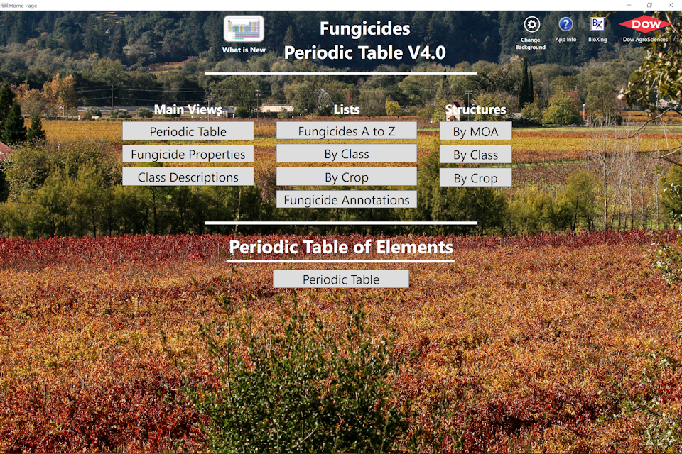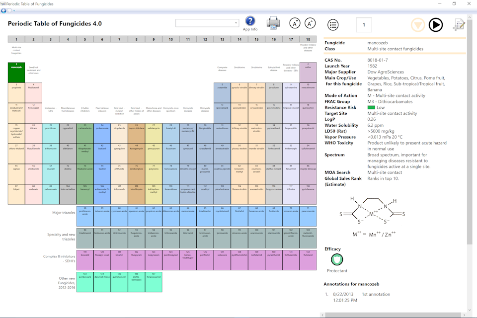 | Periodic Table of Fungicides 4.0 (Desktop) Version 4.0 is a major update to the previous electronic version (3.2), which was released in 2012. Version 4.0 includes updates to the data for all entries. Newly named fungicides and their structures have been added. Various types of information were add including CAS registry numbers, years of first registration or launch, vapor pressure and basic efficacy spectrum. Search capability has been improved by adding a Structure by Mode of Action search feature. In addition to displaying the major crop uses for each fungicide, a comprehensive crop list has been added through which the main fungicides used for each crop can be found. Along with updates to data, the user interface has been updated that facilitates better coordination between each of the application views.