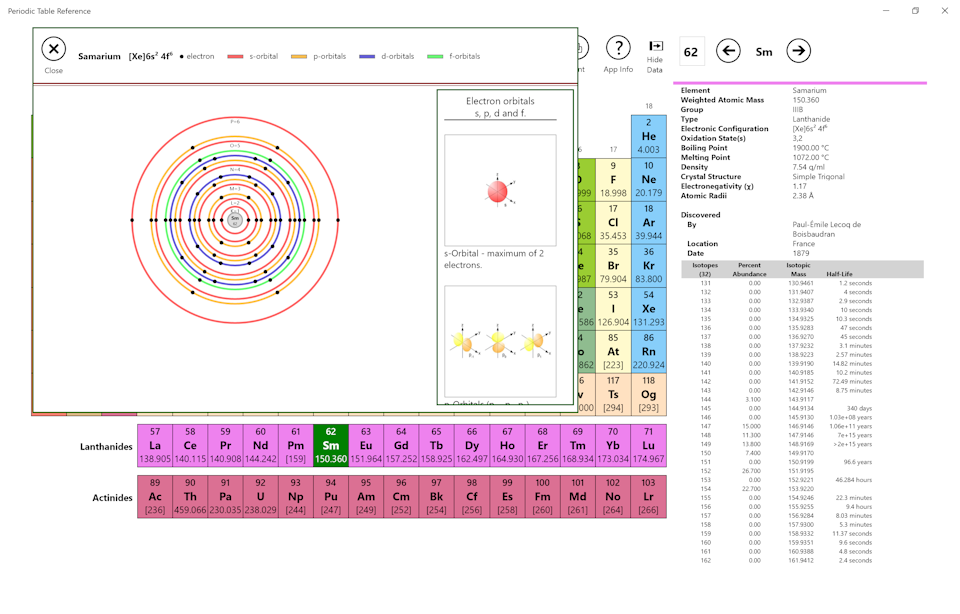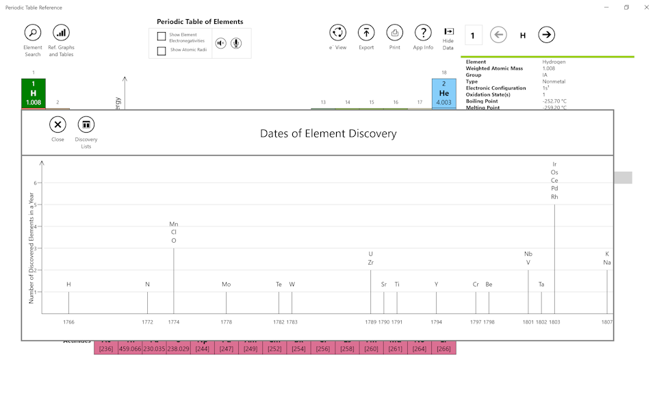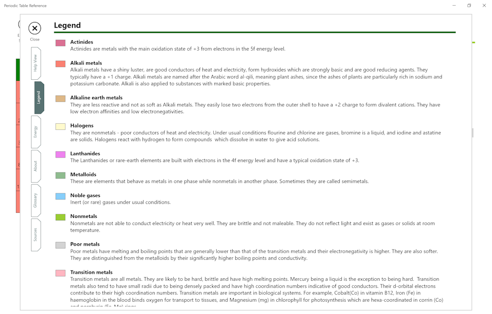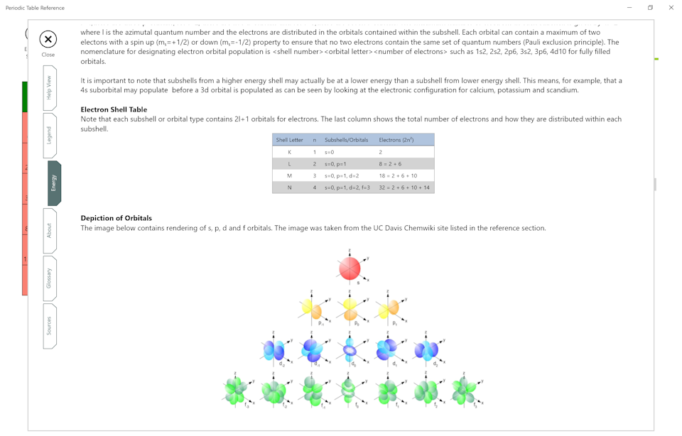 This app displays the periodic table of elements as seen below. It is designed for touch enabled computers and tablets. The table is interactive in that each cell representing an element is touch active. Tapping on an element will display the properties of the selected element. Properties include Atomic and Isotope masses, Group, Type, Electronic Configuration, Oxidation States, Boiling and Melting points, Density, Crystal Structure, Electronegativities and Atomic Radii. Element discovery information is also displayed which includes who or what group discovered the element, location and date of discovery. The Periodic Table and the data for the selected element can be printed and exported to .png formatted image files or to the clipboard. In addition, the app supports printing of the legend, alphabetical and atomic numbered ordered lists and element electronic configurations. An Energy graph of the selected element's electronic configuration showing pairing of electrons with spin up and down arrows is now displayed and updated as an element is selected.. In addition, a timeline graph of the dates of element discovery and a graph of the electromagnetic spectrum have been added as have a number of reference tables. Options have been added that will show within each cell Electronegativities or Atomic Radii. Also, voice output and input has been implemented which is good for students learning the table and those that want to navigate the table quickly. Tapping on the speaker button activates it and then as an element is selected the element name will be pronounced. Tapping on the microphone button activates it and then as the name of an element is pronounced by the user that element is selected. http://apps.microsoft.com/windows/app/periodic-table-reference/61a77348-c8ac-4a0a-996e-b7b3dcd696ca