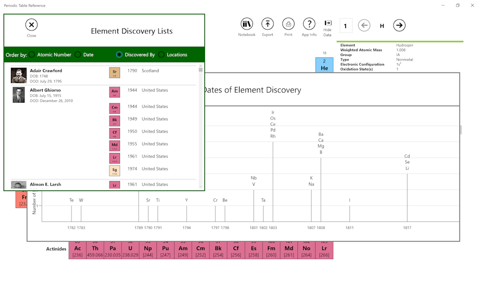 The following two views show the scrollable time line of the dates of element discovery. Moving the pointer over the element symbol will display a tool tip containing the Discovered By and Location data for the element. The second view shows different types of discovery lists with the list by discoverer with their picture being shown.