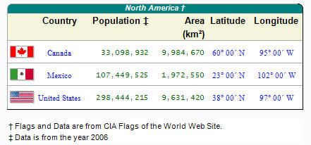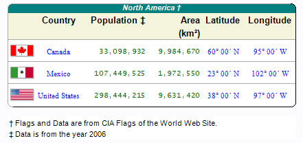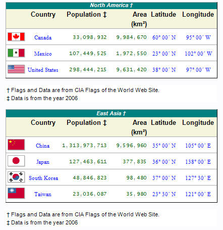 The figure shows two geographic country data tables in one column aligned in the center. The first table was drawn by fitting it to approximately half of the width of a printer page and letting the drawing algorithms determine the width of the columns. The second table used the calculated column width data from the first table which ensured that the widths of the columns in succeeding table would match the first table. The remaining two tables show rounded corner options.